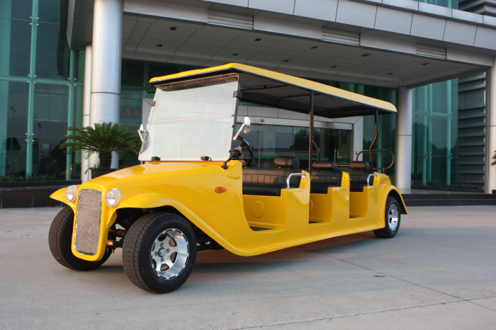 电动老爷车(DN-8D),是为旅游景区、公园、大型游乐场、封闭小区、校园、花园式酒店、度假村、别墅区、城市步行街、机场、港口、高尔夫球场等开发的环保型乘用车辆。整车性能卓越、外观别致典雅、内饰豪华、乘坐舒适安全。