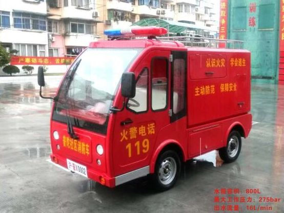 电动小型消防车是最新研发出来的新型产品。因驱动方式为直流电机驱动。不需加油,行驶可以灭火。车上配有高压水泵、消防锤及灭火器等工具。